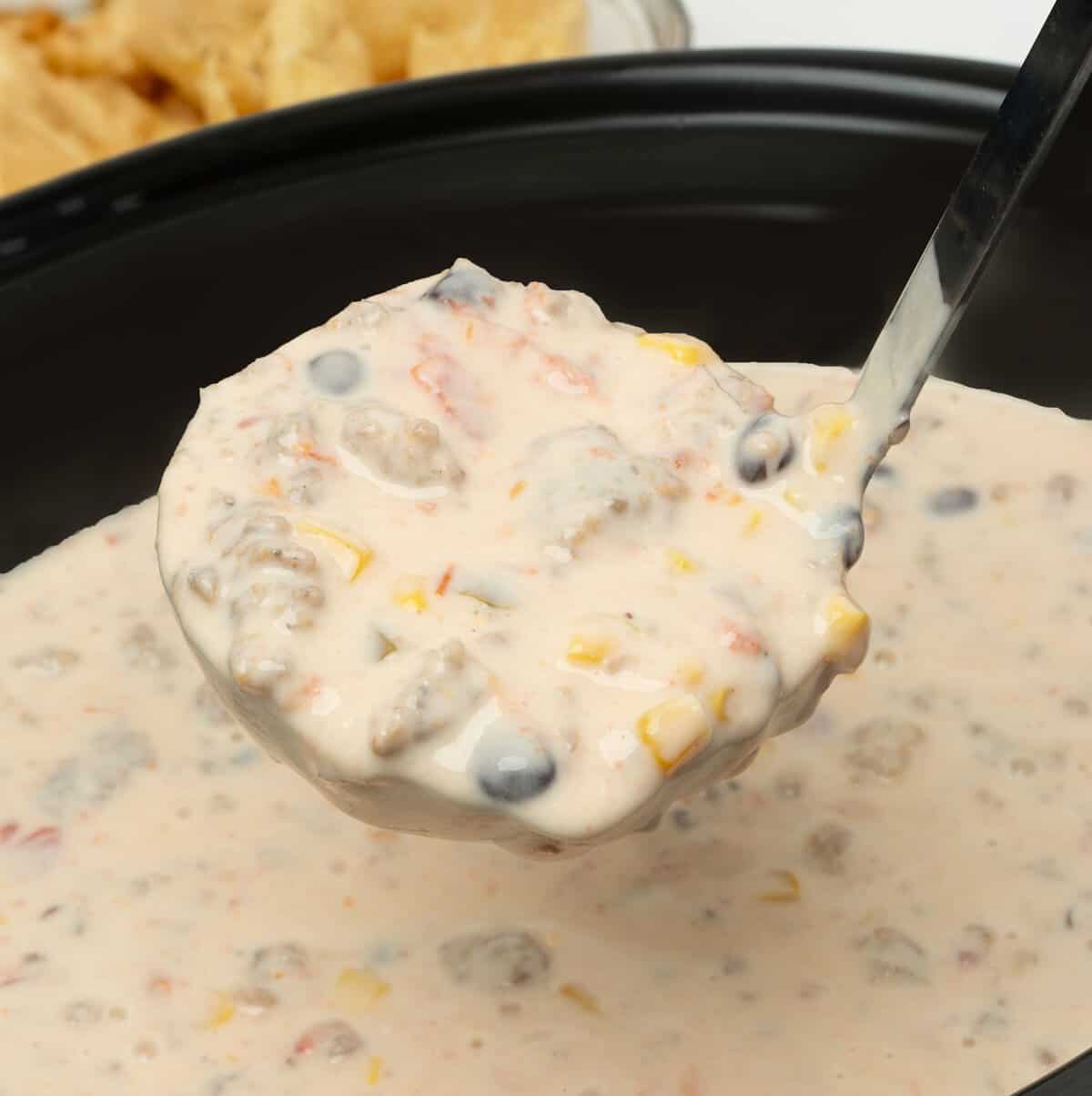0 In a skillet over medium heat, cook the pork sausage ([adjustable]1[/adjustable] pound) until browned and fully cooked through. Drain any excess grease and transfer the cooked sausage to the crockpot. 3 Drain the corn ([adjustable]15[/adjustable]-ounces) and black beans ([adjustable]15[/adjustable]-ounces), then add them to the crockpot mixture. I like to rinse the beans but it's not necessary. 1 Cube the Velveeta Queso Blanco ([adjustable]32[/adjustable]-ounces), then add to the crockpot with the sausage. 2 Add cream cheese ([adjustable]4[/adjustable]-ounces), Rotel ([adjustable]20[/adjustable]-ounces, undrained), into the crockpot. 4 Stir all ingredients to combine well. Cover the crockpot with a lid and set it to "low" for about 2 hours, stirring occasionally, until the cheeses are fully melted and the dip is smooth and creamy. 6 Once everything is melted and well-combined, give the dip one final stir and serve it warm with tortilla chips.View original recipe